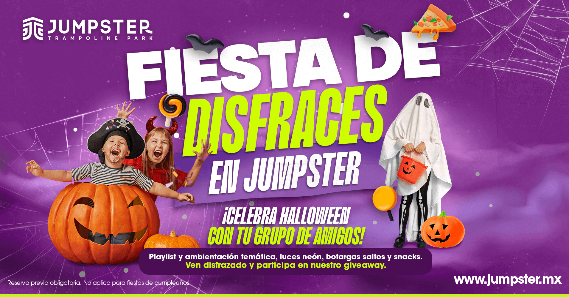 Celebra Halloween a lo grande con tu grupo en Jumpster. Luces neón, playlist temática, botargas y saltos épicos. ¡Vengan disfrazados y vivan una experiencia única!