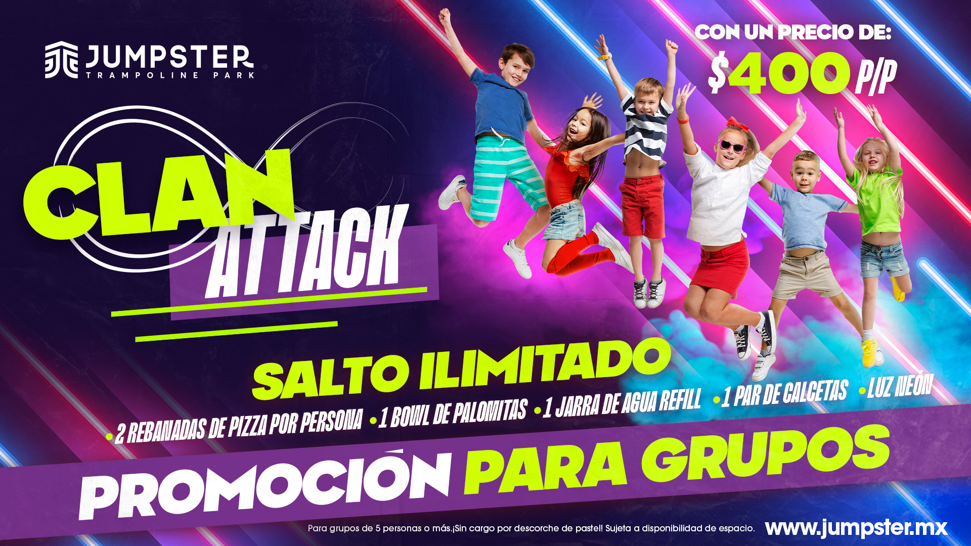 Reúne a tu grupo favorito y prepárense para vivir una tarde épica llena de salto y diversión. Perfecto para compartir pizza, palomitas, y un ambiente único bajo luces neón.
